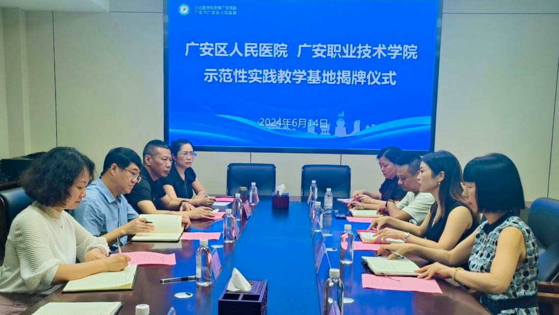 揭牌仪式前,双方召开了座谈会。医学院院长杨书琴对广安区人民医院的大力支持表示衷心感谢!同时对医学院办学模式、师资力量、专业建设、人才培养模式等方面做了详细的介绍。她希望通过本次合作,校院双方能共同为广安培养更多高水平的医务人员,实现校院深度合作,产教融合。