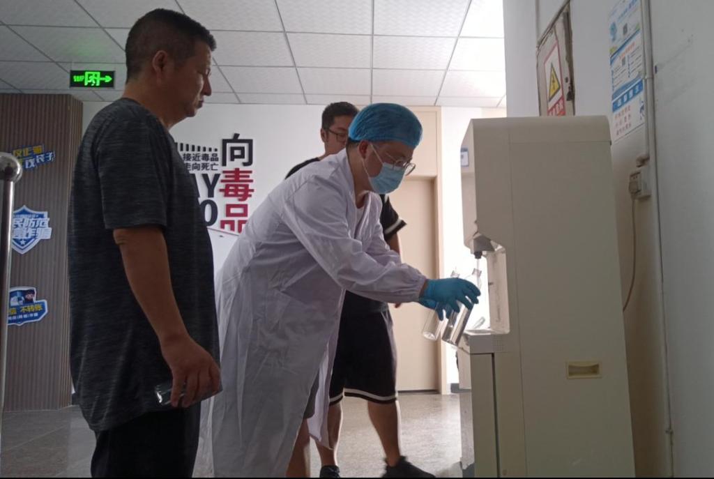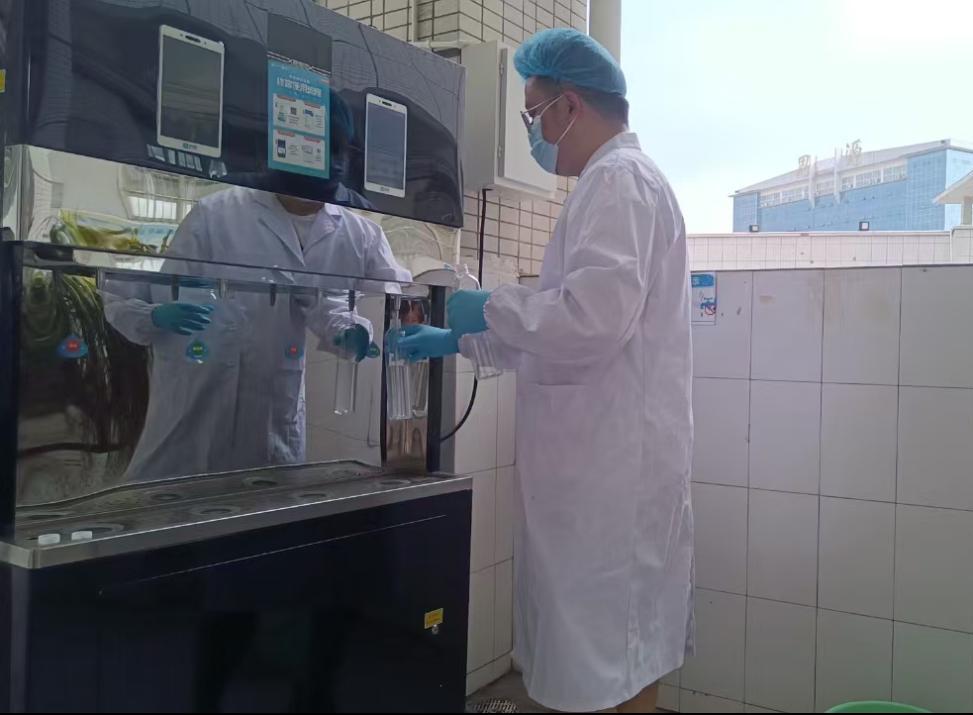 第三方机构检测人员随机抽检教学楼、宿舍楼等区域的直饮水水质,并在第一时间将水样送达实验室开展检测并出具报告。