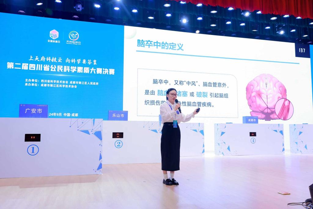 比赛以“上天府科技云,向科学要答案”为主题,分为科普大家说(主题展演)、必答题、抢答题、风险题四个环节,涵盖科学家精神、智能科技、生命健康、绿色低碳、防灾减灾、食品安全、科学生产、移风易俗等多个领域。李越同学代表广安市参加第一个环节“科普大家说”主题展演的比拼,以《“卒”可及防,“识”不宜迟》作为演讲主题,对脑卒中的识别和预防进行科普,讲解内容立足科学、着眼生活。比赛现场气氛紧张而热烈,各选手在展示各自风采的同时,也为全省观众奉上了一场科普“大餐”。