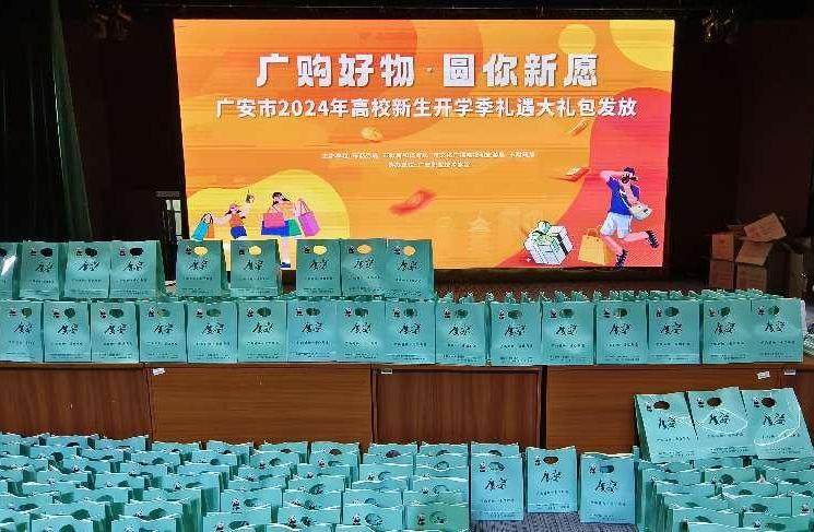 为深入贯彻落实习近平总书记来川视察重要指示精神,营造为国选才、为国育才、礼遇人才的良好氛围。由四川省商务厅、四川省文化和旅游厅、四川省教育厅、四川省财政厅指导,广安市商务局、广安市文化广播电视和旅游局、广安市教育和体育局、广安市财政局承办的“蜀里安逸·圆你新愿”四川高校新生开学季礼遇大礼包发放活动于2024年9月30日在杏坛进行,2024级4000余名新生参加了发放活动并领取了礼包。