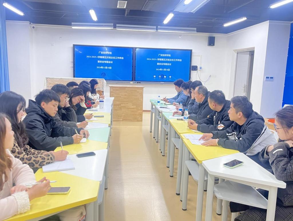 为加强学院安全管理,保障师生生命财产安全和正常的教学秩序,广安技师学院于11月18日晚在岳秀楼303召开安全工作专题会议。唐元刚副书记、招生与学生工作部全体人员、学院全体班主任参加了此次会议。