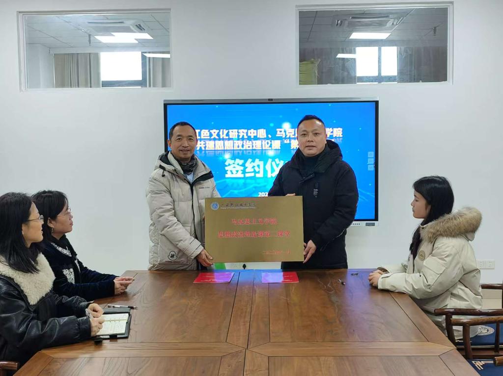 1月7日下午,红色文化研究中心、马克思主义学院在大学生创业园721会议室举行了共建思想政治理论课“第二课堂”签约仪式。红色文化研究中心主任曹馨、马克思主义学院院长石乾福出席了签约仪式,代表各自单位签署了合作协议,并在红色文化研究中心挂牌。