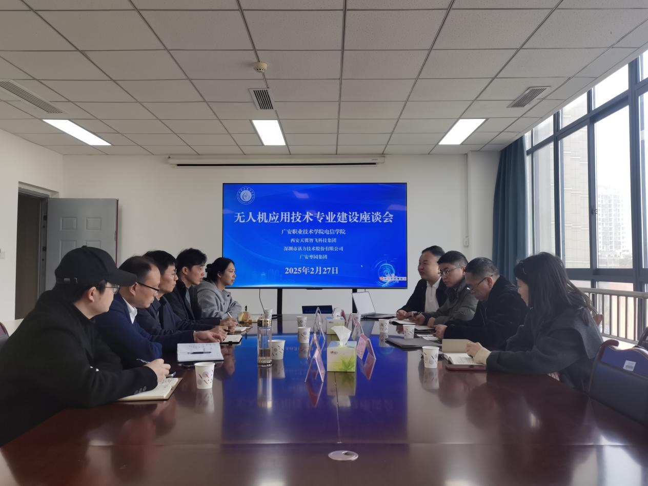本次座谈会邀请了深圳市讯方技术股份有限公司、西安天翼智飞科技集团有限公司、广安枣园投资开发集团有限公司等企业代表,就无人机技术的应用前景、产业发展趋势以及校企合作模式展开深入交流。与会企业分享了无人机行业发展趋势,重点介绍了无人机在农业植保、巡检、测绘、编队表演、物流运输、应急管理、影视拍摄等领域的具体应用场景,以及无人机产业链上下游的就业方向,包括生产、安装、调试、飞控、维修、营销和应用研究情况等。