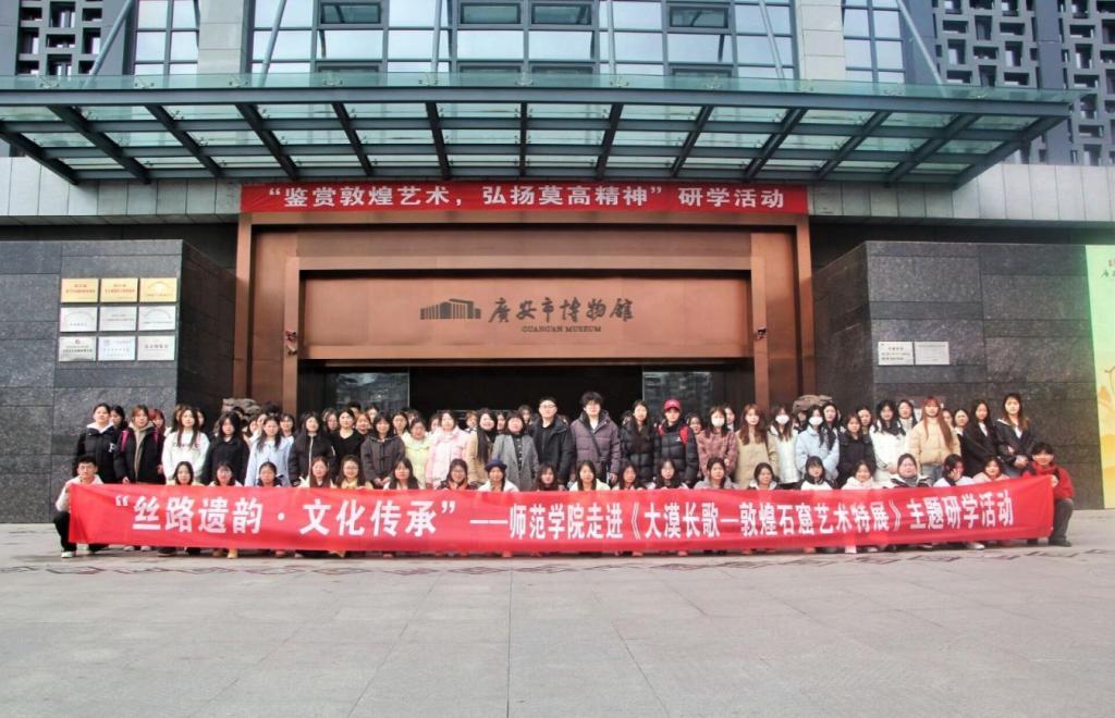 3月4日下午,在由kaiyun登录中国入口登录与广安市文化广播电视和旅游局共同主办,广安市博物馆、kaiyun登录中国入口登录红色文化研究中心及各二级学院承办的“鉴赏敦煌艺术·弘扬莫高精神”研学活动总方案安排下,师范学院结合学院的思政育人目标,组织了120名学生赴广安市博物馆开展了“丝路遗韵·文化传承”——走进《大漠长歌—敦煌石窟艺术特展》主题研学教育活动。