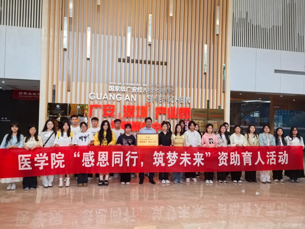 为深入贯彻落实国家资助政策,深化资助育人成效,激励受助学生奋发自强、感恩奉献,4月23日下午,医学院组织开展“感恩同行,筑梦未来”资助育人走进广安深广产业园研学活动。2024年度“易人和奖学金”获奖学生及新生助学金获得者等30余名学生参加活动。易人和科技集团有限责任公司董事长罗中华,医学院党总支书记喻忠,党总支副书记吴黎明,组织员汪建宏,学生科科长陈江及学生科全体教师及辅导员代表出席。