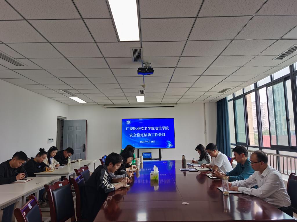 4月25日下午,电信学院召开安全稳定信访工作会议,传达学习全省教育系统安全稳定信访工作视频会议精神和学校安全稳定信访工作会议精神,集中排查安全隐患,研究制订防范措施和整改措施。会议由学院党总支书记张义桥主持,学院行政负责人王凤领、党总支副书记黄艳红、副院长赵勇出席会议并讲话。