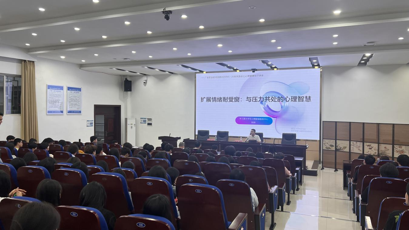 为增强学院师生心理健康素养,提升心理认知和情绪管理能力,预防心理危机,筑牢校园安全防线,5月7日晚,广安技师学院招生与学生工作部在学校先圣厅组织了一场以“拓展情绪耐受窗—与压力共处的心理智慧”为主题的心理健康讲座。学院全体学生工作管理人员、180名学生参加本次讲座。