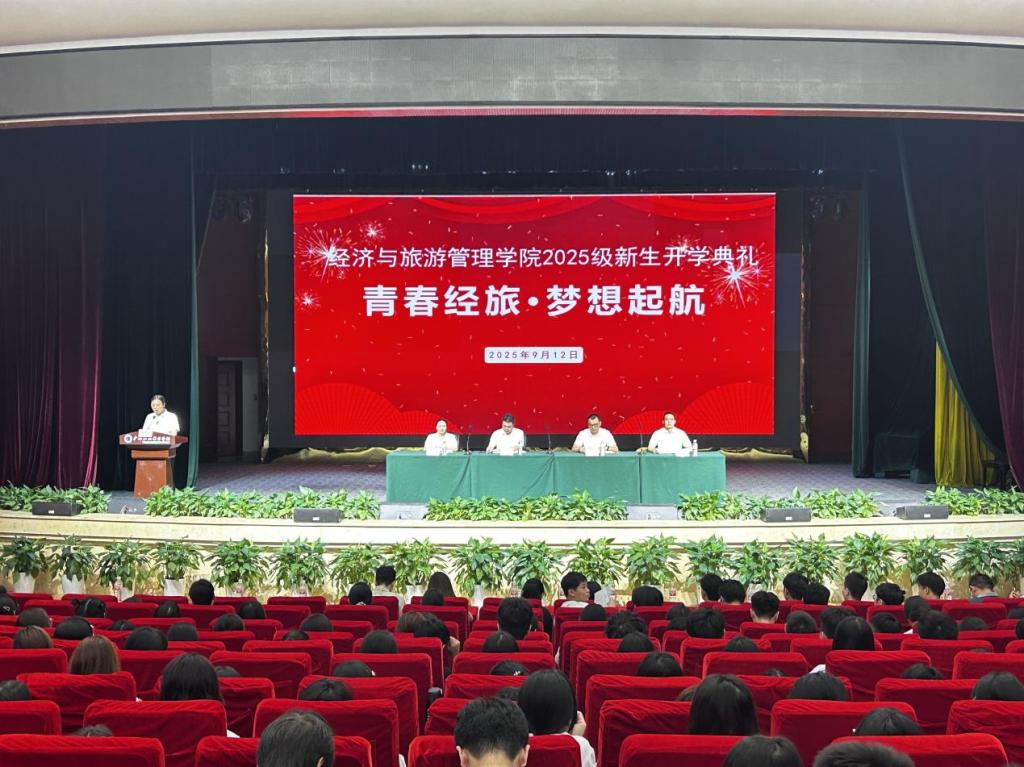 秋阳和煦,杏坛生辉。9月12日上午,经济与旅游管理学院2025级新生开学典礼在杏坛隆重举行。学院党总支书记吴小平、院长郭智伟、党总支副书记杨燕、副院长张浩,各科室负责人、专业带头人、新生班导师及全体2025级新生共同参加了这一庄严而热烈的仪式。