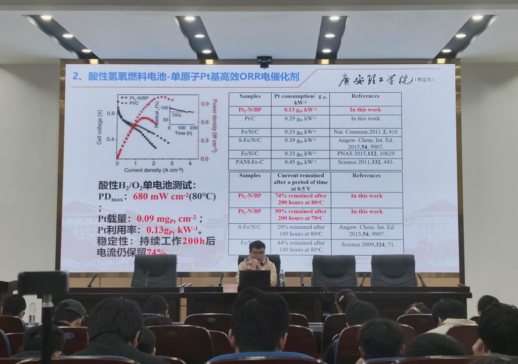刘京结合研究团队公开发表的多项研究成果,具体阐述了电催化剂在碱性/酸性燃料电池、质子交换膜水电解技术及锌空气电池中的实际应用效果与性能优势,并指出碳缺陷、氮掺杂、合金化等策略在提升铂原子利用率与催化活性方面的关键作用。