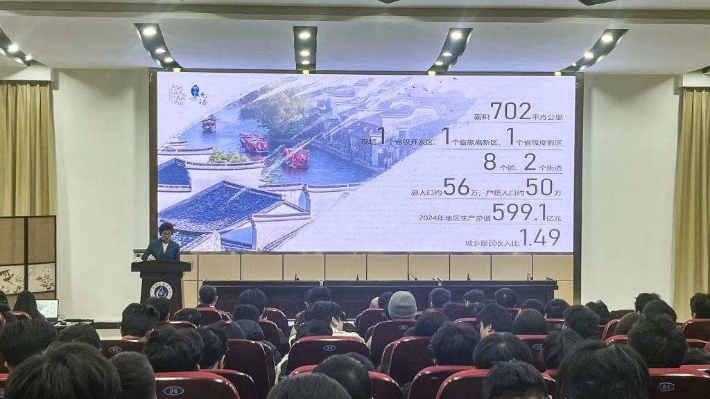 於丽围绕南浔区的辖区面积、人口规模、经济发展、区位优势、历史文化底蕴、杰出人物和知名企业等方面作了全面介绍,重点解读了针对外地大学生到南浔就业、创业的各类优惠政策和补贴措施。最后,她向在场200余名学生发出诚挚邀请,欢迎他们选择南浔,在这片热土上实现就业创业梦想。