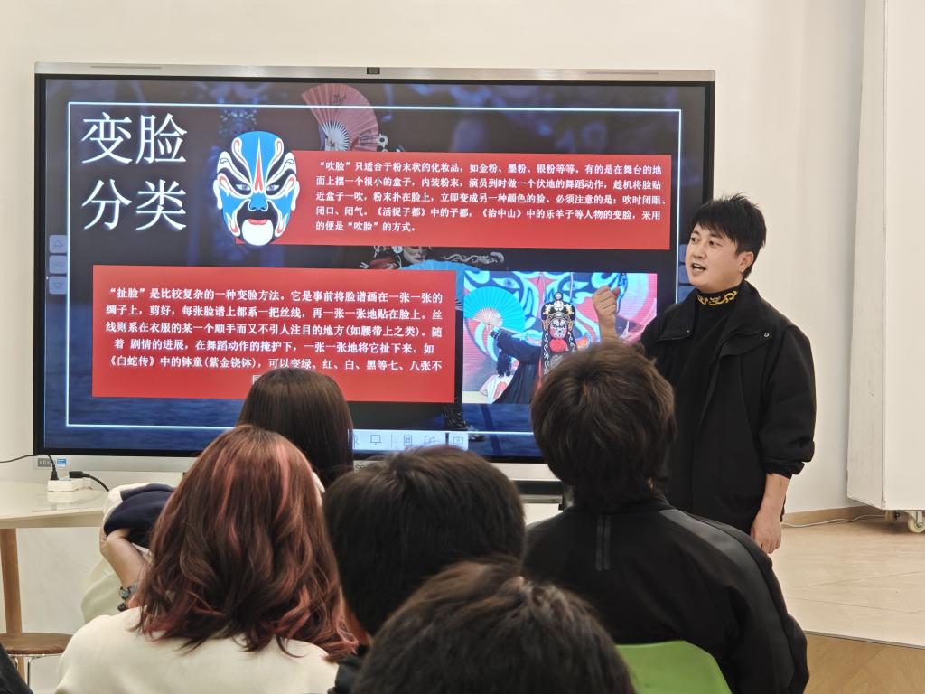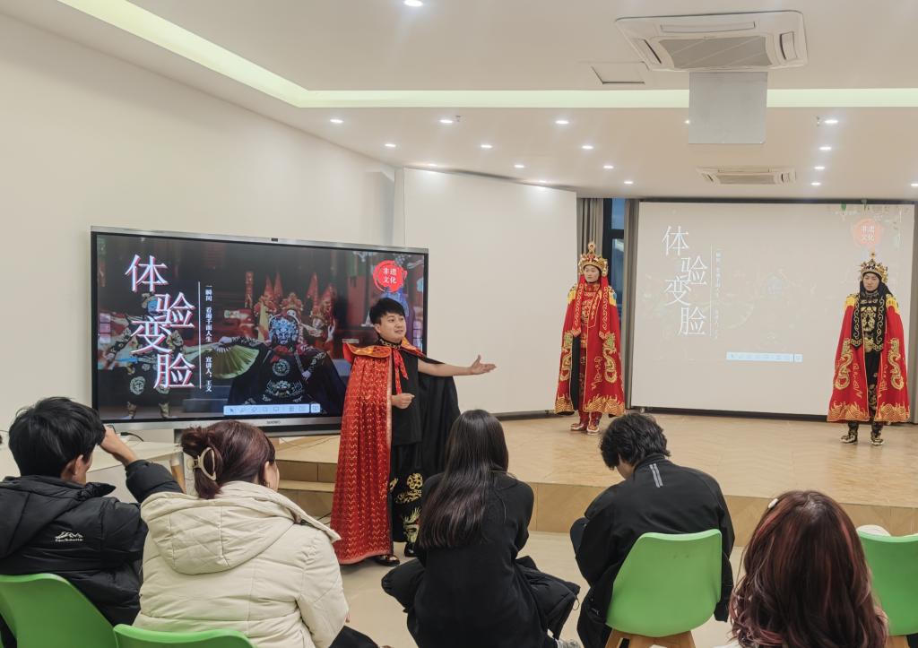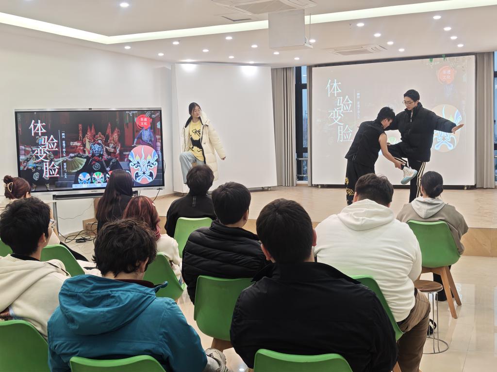 学校非遗传承与职教融合发展科研创新团队对活动提供了专业支持与建议,设计了“布里生花”扎染与“脸谱乾坤”川剧变脸两大非遗体验环节。在专业教师的指导下,学校德馨国学社、青蓝文创社的同学与外国同学协作创作,亲手体验了从布料捆扎、浸染到图案呈现的完整扎染工艺,感受了东方色彩随机天成的美学魅力。川剧变脸环节中,同学们了解川剧及变脸艺术的历史、行当、脸谱象征意义后,还在老师指导下穿上特色服装进行了经典戏曲身段学习和变脸绝技的体验展示,现场互动频频,气氛热烈。