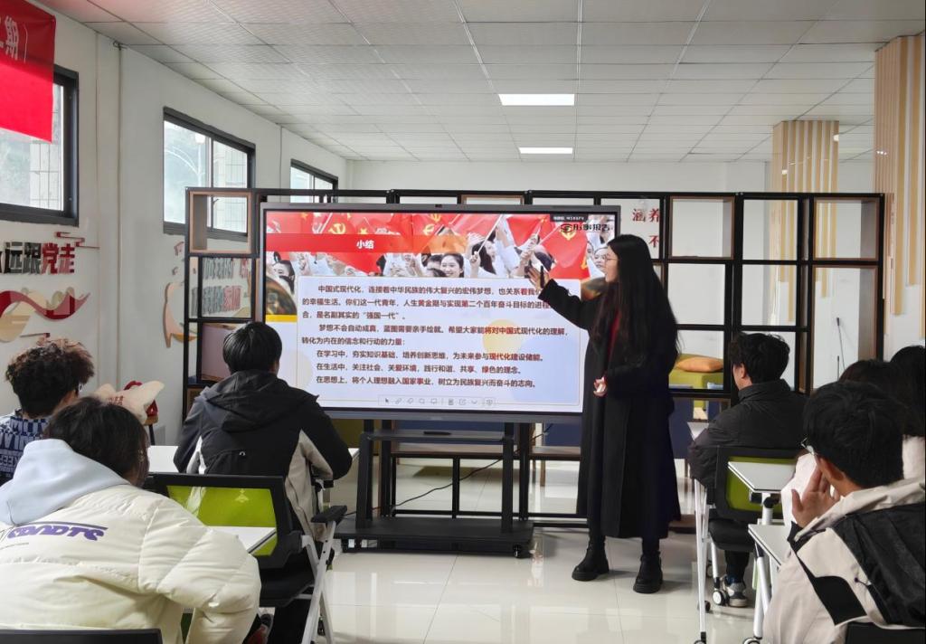为深入学习宣传贯彻党的二十大和二十届历次全会精神,推动习近平新时代中国特色社会主义思想入脑入心,12月18日,马克思主义学院“思源”宣讲团,依托“一站式”学生社区平台启幕“青春筑梦・思想领航”主题微课堂(第二期)。这支由全校思政教师与辅导员骨干组建的宣讲队伍,以“伟人故里铸魂育人”的红色育人基因作底色,围绕“中国式现代化——青年眼中的发展图景”主题,与近30名学生代表在社区育人空间中展开思想共鸣。