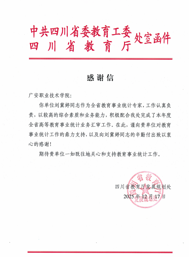 近日,中共四川省委教育工委、四川省教育厅发展规划处正式发来感谢信,专门向学校及学校刘冀婷同志致以诚挚谢意,对kaiyun官网在本年度全省高等教育事业统计工作中的通力协作给予高度认可。