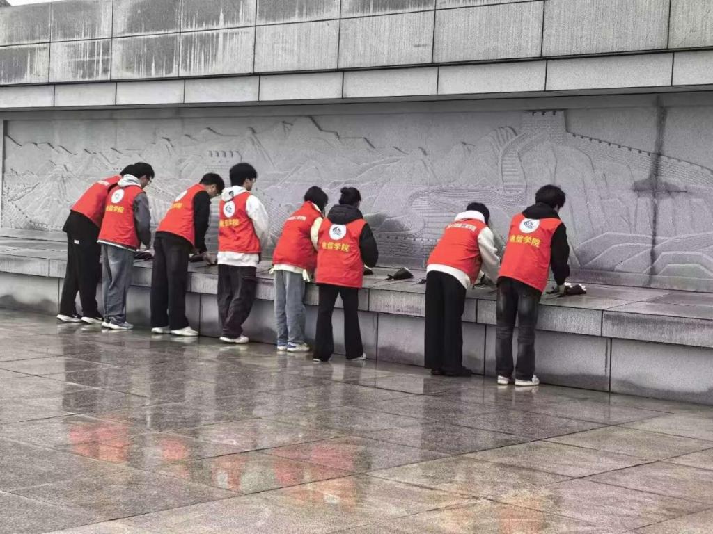 抵达陵园后,志愿者们统一着装、列队整齐,在庄重肃穆的氛围中迅速投入服务。大家分工协作、认真细致,对墓区、纪念广场、道路及绿化带进行全面清扫,清理落叶、纸屑与杂物,仔细擦拭烈士纪念碑、墓碑、宣传栏与休息座椅。以实际行动守护英烈安息之地,维护红色阵地的整洁庄严。在祭扫服务引导中,志愿者们耐心为群众提供路线指引,积极倡导鲜花祭扫、无烟祭扫、文明祭扫新风尚,主动劝阻不文明行为,维护现场秩序,用真诚服务展现青年学子的良好风貌,用实际行动表达对革命先烈的崇高敬意。在纪念碑前肃立默哀、敬献小白花,在庄重的仪式中感悟革命精神、接受红色洗礼,瞻仰烈士纪念碑。大家在缅怀中坚定理想信念,在实践中厚植家国情怀,进一步增强了历史责任感与时代使命感,进一步厚植家国情怀,赓续红色血脉。