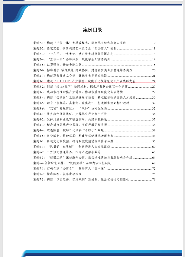 近日,由四川省教育评估院编制的《四川省职业教育质量报告(2025年度)》正式发布,从全省高职院校报送的材料中共遴选出了26个案例、25个专栏。新材料与化学工程学院提交的“‘1+1+1+N’产业学院,赋能千亿级绿色化工产业集群发展”案例成功入选。