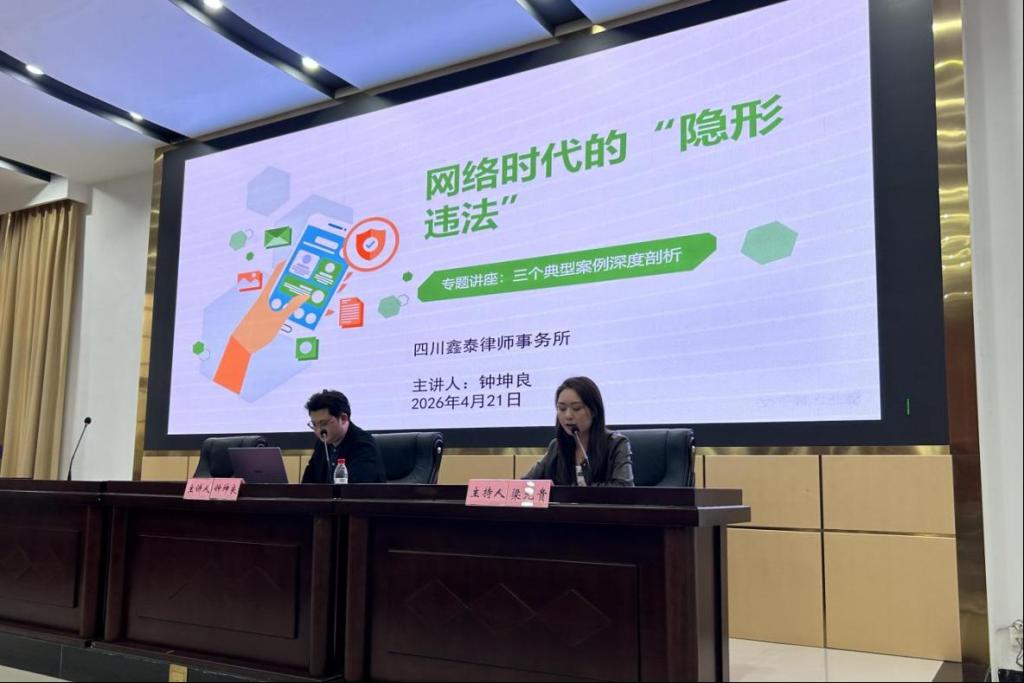 4月21日,学校2026年春季法治宣传教育系列活动的重要组成部分——“网络时代的‘隐形违法’案例分析”专题讲座及现场法律咨询活动顺利开展。本次活动旨在深入学习贯彻习近平法治思想,落实四川省青少年“法治护航·成长赋能”八项行动要求,切实提升师生法治素养,营造尊法学法守法用法的浓厚校园氛围。