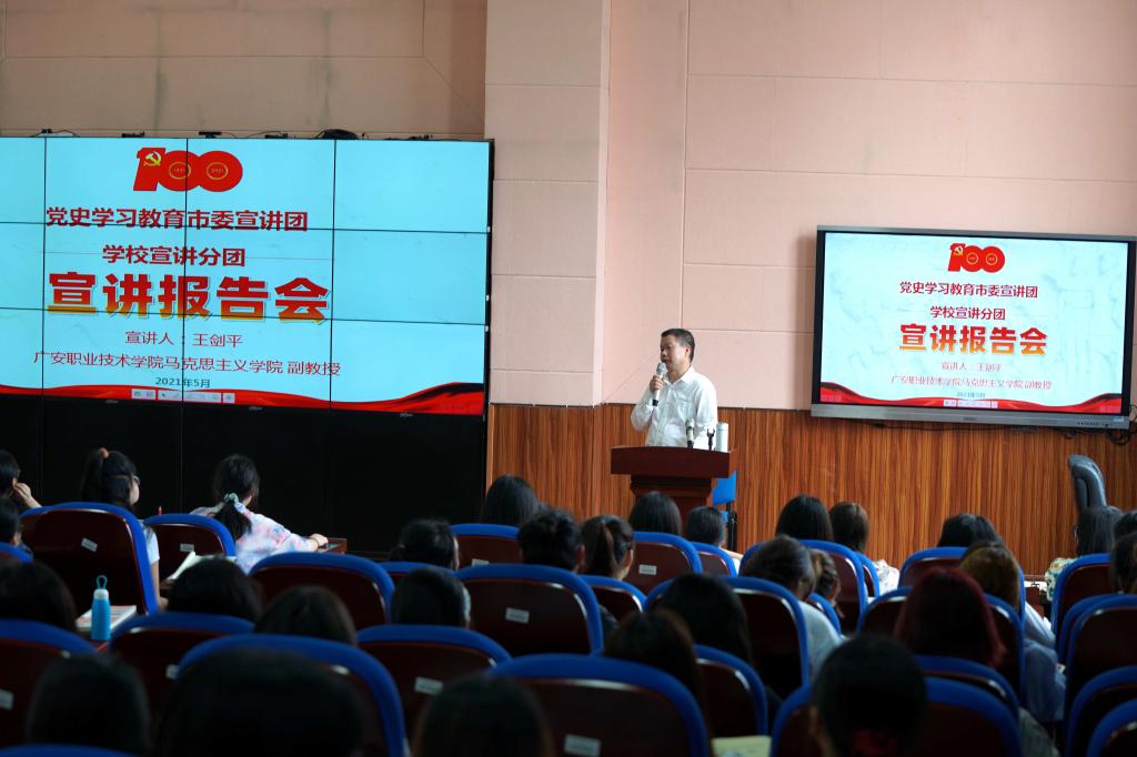 5月14日下午,市委宣讲团第九分团成员、学校马克思主义学院副教授王剑平在紫金厅为200余名学生作党史专题宣讲。