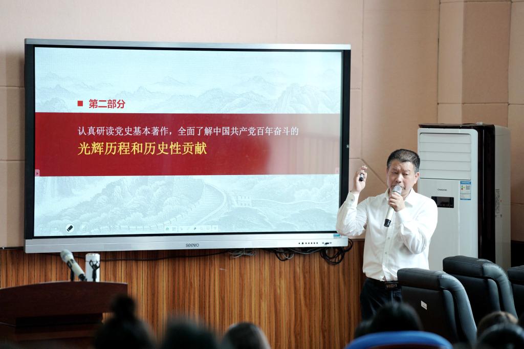 王剑平围绕“深入学习领会习近平总书记关于党的历史的重要论述,充分认识开展党史学习教育的重大意义”“认真研读党史基本著作,全面了解中国共产党百年奋斗光辉历程和历史性成就”“深刻把握开展党史学习教育的重点”“开展党史学习教育,要学懂弄通做实习近平新时代中国特色社会主义思想,增强‘四个意识’、坚定‘四个自信’、做到‘两个维护’”四个方面,结合中国共产党艰苦奋斗、改革发展的历史,为大家深入浅出地阐明了“为什么要学党史”“党史学什么”和“如何学习党史”三大问题。王剑平指出,党史学习教育是高校师生的必修课,党史学习不能止于书本理论,要带着问题学,深入实践,只有理论和实践相结合,才会发现其中魅力,了解其中思想精髓。