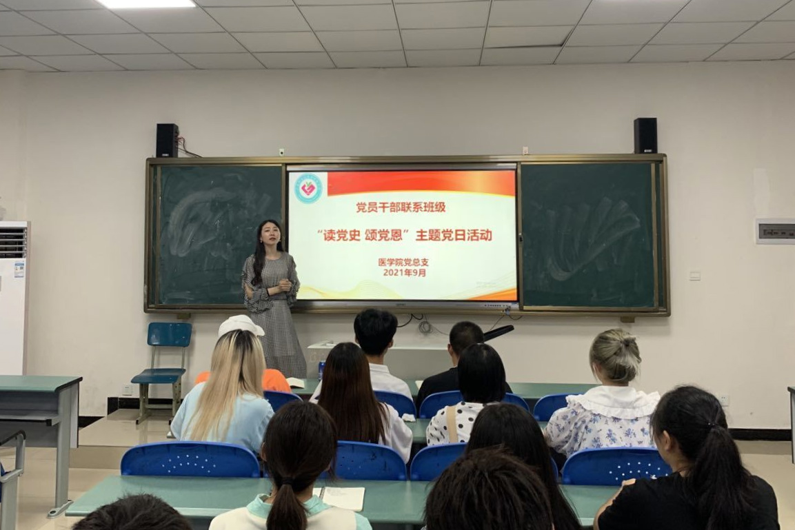 为进一步学习领会习近平总书记在中国共产党成立100周年上的讲话精神,高标准高质量开展党史学习教育,落实为党育人、为国育才的根本任务,医学院党总支近期组织党员开展了“读党史、颂党恩”主题党日活动,全体党员分别到联系班级开展了“党史学习教育”宣讲活动。