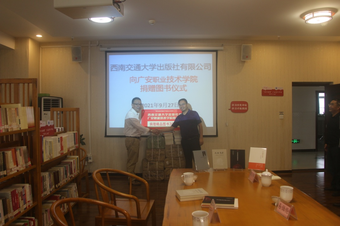 9月27日,西南交通大学出版社有限公司副社长易伯伦一行4人到kaiyun官网进行图书捐赠活动,学校党委委员、副校长邓廷奎出席捐赠仪式。