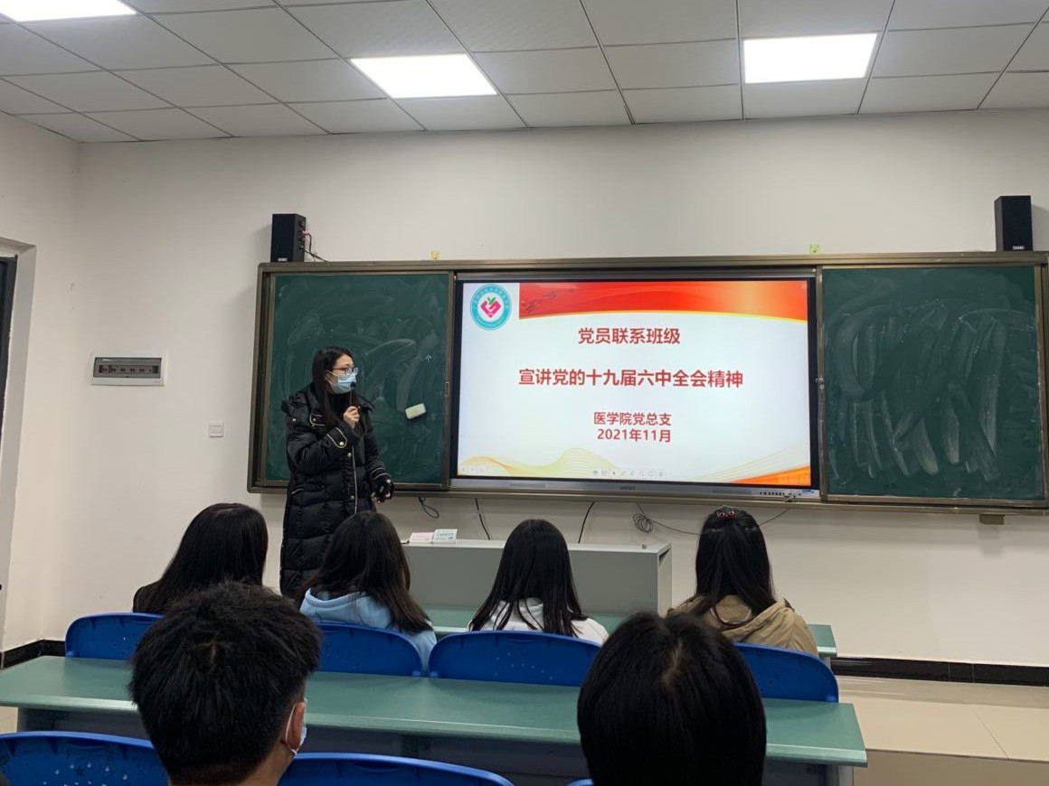 为进一步学习贯彻中国共产党十九届六中全会精神,高标准高质量开展党史学习教育,落实为党育人、为国育才的根本任务,医学院党总支近期组织党员开展了“以史为鉴、开创未来”主题党日活动,全体党员深入联系班级开展中国共产党十九届六中全会精神宣讲活动。