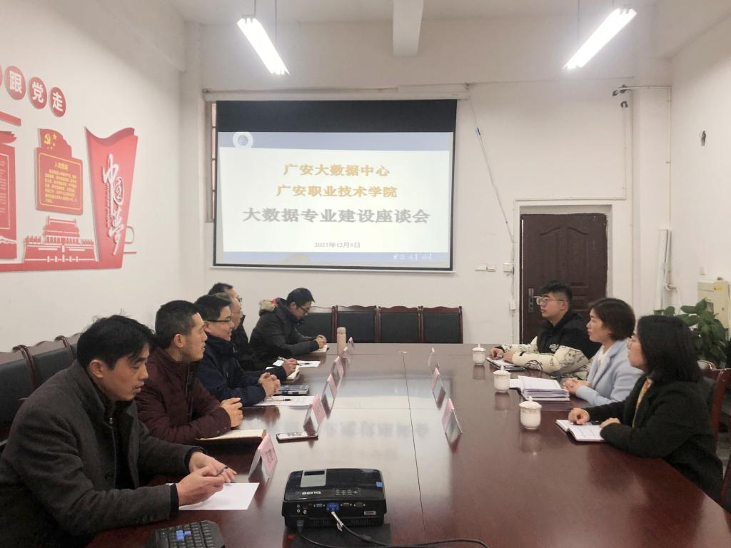 在调研座谈会上,大数据中心领导与电子与信息工程学院、信息中心负责人和专业带头人进行了交流。大数据中心科长周莉莉详细介绍了广安市智慧政府、数字经济产业园等大数据项目建设情况以及广安市大数据产业的发展和前景,迫切需要广安本地的大数据人才支持广安市大数据产业的发展。电信学院院长曾德贵对电子与信息工程学院的专业情况和人才培养做了详细介绍,希望大数据专业真正对接地方产业,为广安市政府、行业、学校服务。
