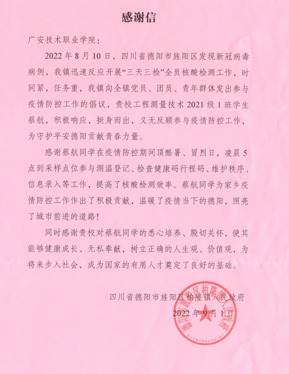 近日,kaiyun官网收到一封来自德阳市柏隆镇人民政府的感谢信。信中对kaiyun官网工程测量技术2021级1班蔡航同学主动请缨争当疫情防控志愿者、为当地疫情防控工作贡献青春力量提出了高度肯定和表扬,对学校培育学生乐于奉献和敢于担当的优秀品质致以衷心的感谢。