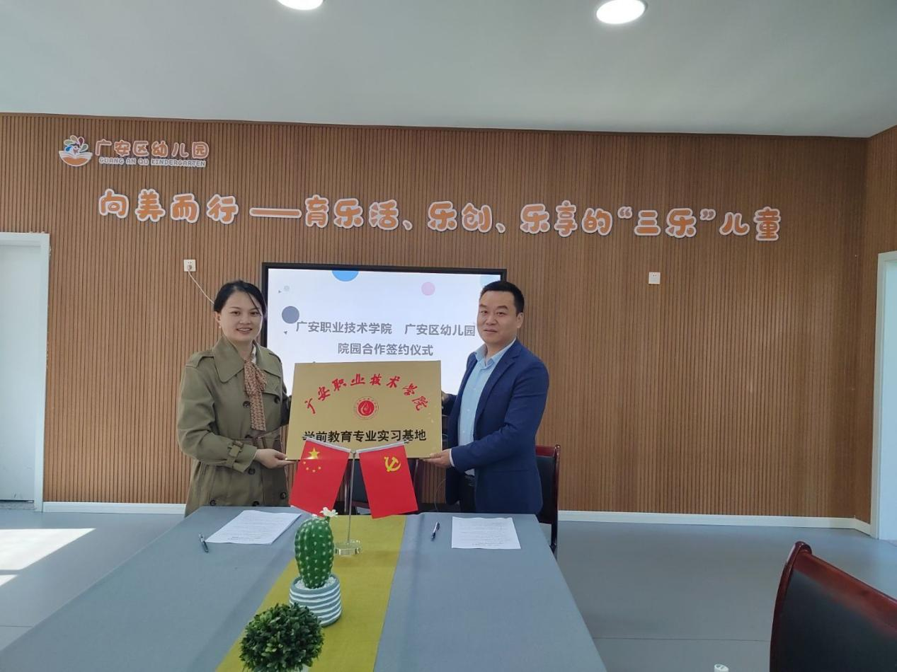 新建的校外实训基地分别是广安市直属第五幼儿园、广安市广安区幼儿园、广安市经开区第二幼儿园,均为广安市内优质公立幼儿园。彭松林与各校外实训基地签订了院园合作协议并举行校外实训基地挂牌仪式。