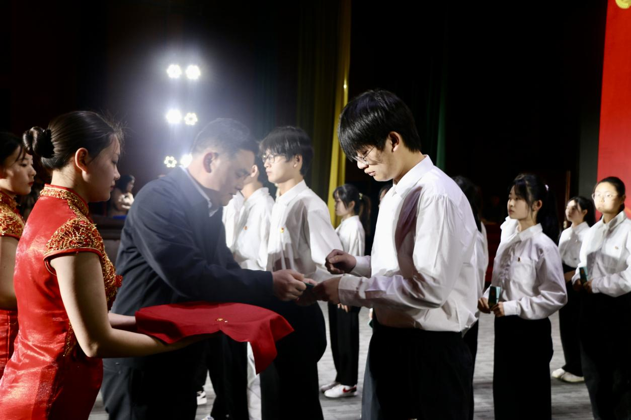 共青团广安市委副书记戚文胜向新团员代表颁发团员证并佩戴团徽。出团旗、奏团歌,新团员面向团旗庄严宣誓,老团员重温入团誓词。