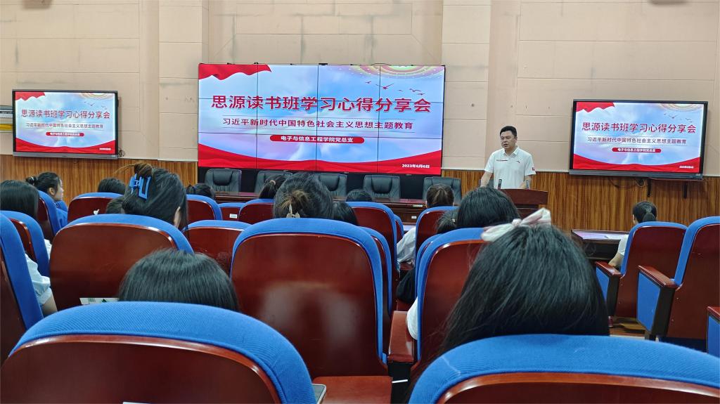 6月6日,电子与信息工程学院党总支近90名入党积极分子齐聚紫金厅,开展思源读书班读书心得汇报交流会。学院党总支书记吴小平参加会议并做了讲话。