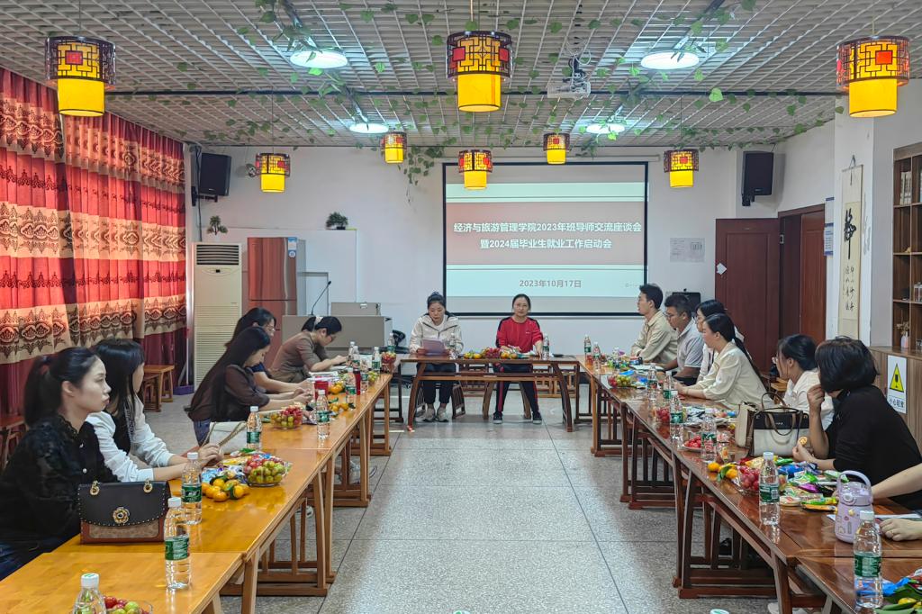 2023年10月17日,经济与旅游管理学院在九思楼茶艺实训室召开2024届毕业生就业工作启动会暨学生管理工作交流座谈会。学院学管线干部、工作人员、2023届毕业班班导师、全体辅导员、教研室主任参加了会议。