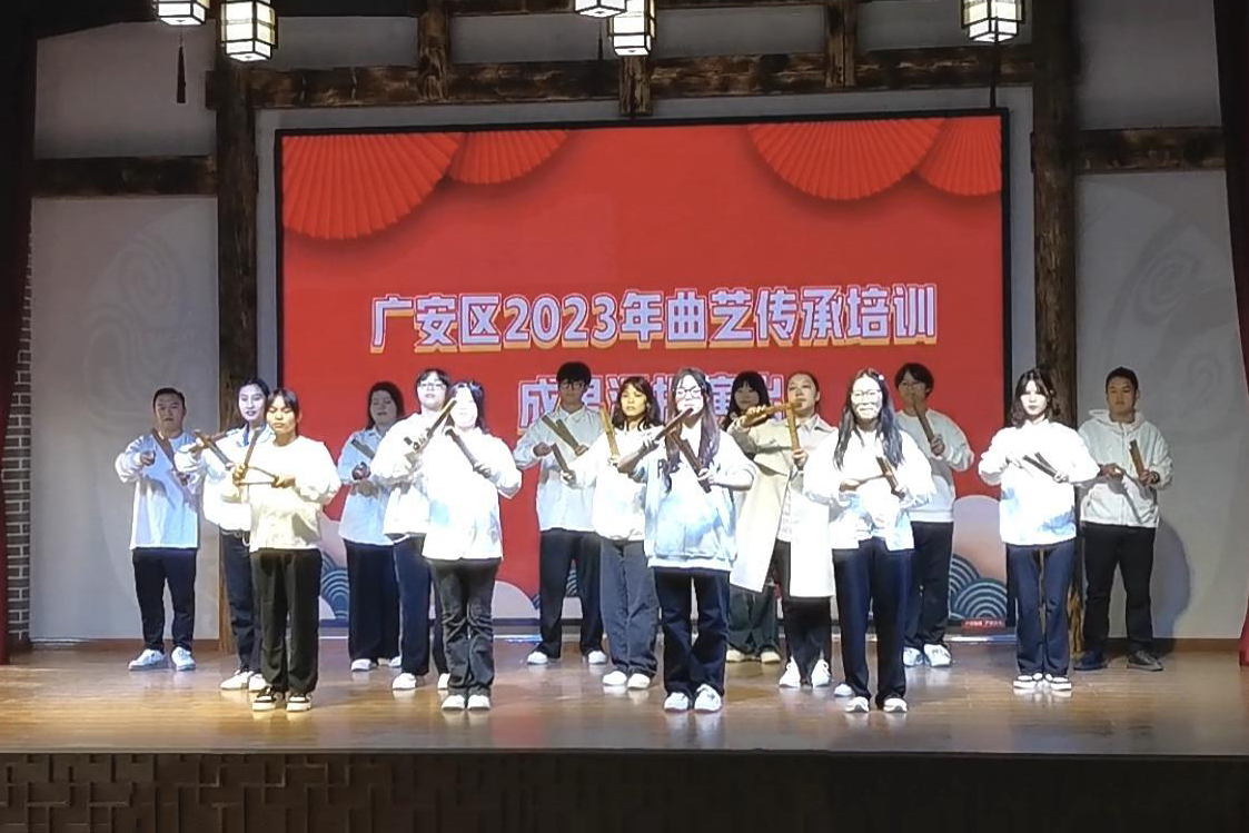 本次讲座分为培训和演出两个阶段。讲座中胡俊杰老师详细讲解了“四川金钱板”的“打、说、唱、演”四种表现形式和演唱技巧。通过培训,学员们掌握了基本的表演技法,以及金钱板传统曲目《山顶开花山脚香》的演唱。组织此次参训学员还参加了广安区翠屏社区曲艺大舞台的曲艺惠民演出。