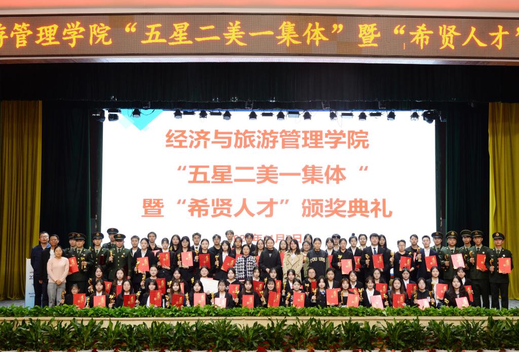 11月7日晚上,经济与旅游管理学院2023年度“五星二美一集体”暨“希贤人才”颁奖典礼在杏坛举办,学院党总支书记谭燕、副书记杨燕、副院长邓小辉、各科室负责人、获奖同学以及大一、大二全体同学参加了颁奖盛典。颁奖盛典在庄严的国歌中拉开了序幕,参会领导为获奖同学颁奖,获奖代表发表了获奖感言。
