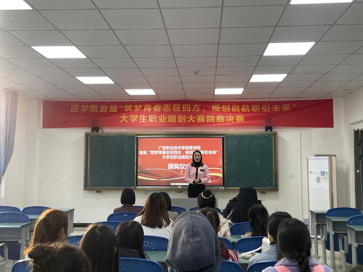 为了更好地帮助大学生规划自己未来职业发展道路,11月17日下午,医学院首届“筑梦青春志在四方,规划启航职引未来”大学生职业规划大赛院赛决赛在崇贤楼117、118教室顺利举行,学院院长杨书琴、党总支书记喻忠、副书记吴黎明、副院长罗巧、副院长贺洪军、招生就业办公室主任赵婧羽、校企合作部部长杨卉、组织员张欢、实训中心主任赵静、教学科研部部长向丹参加了本次活动并分别担任成长赛道与就业赛道的评委。