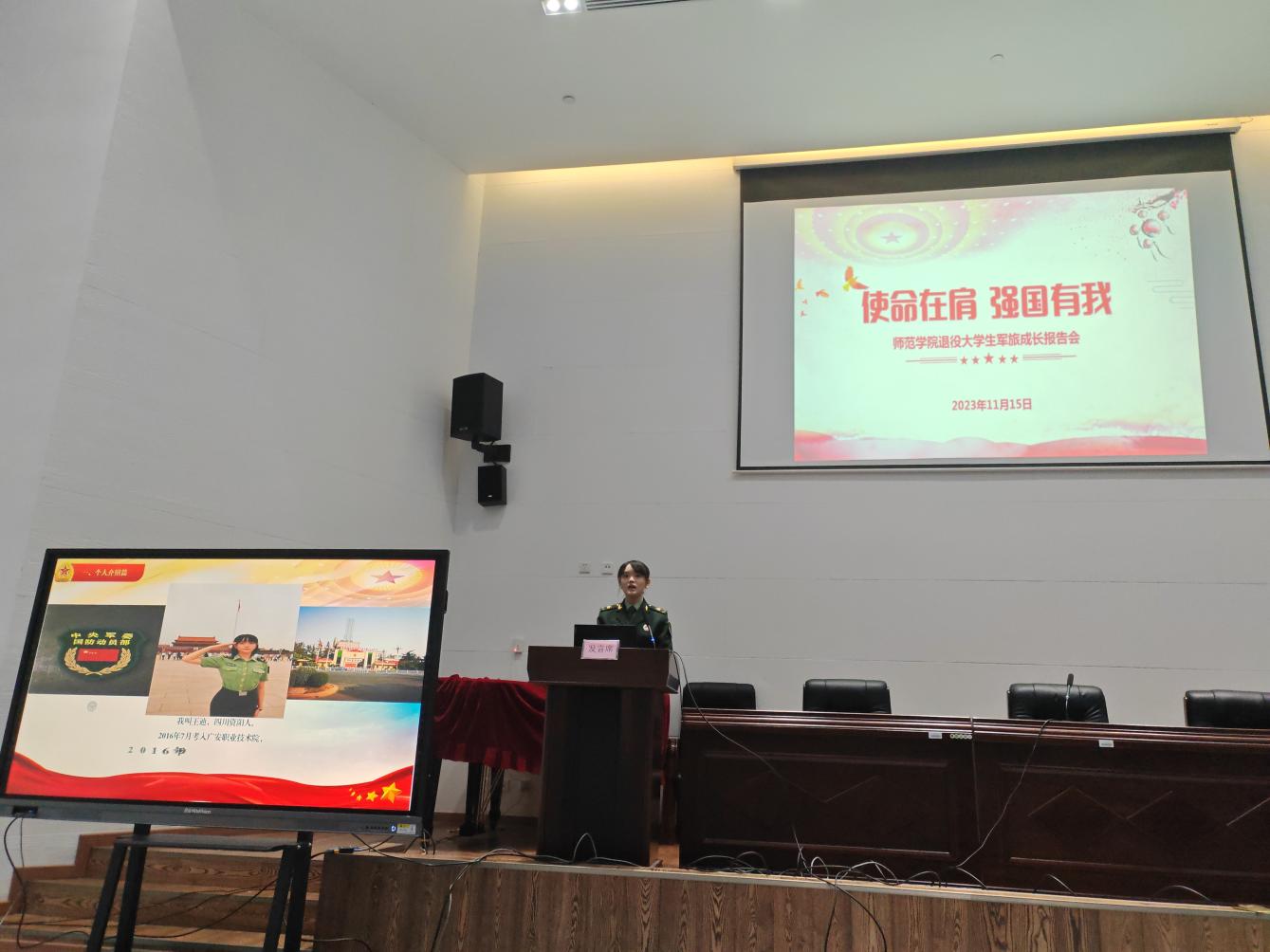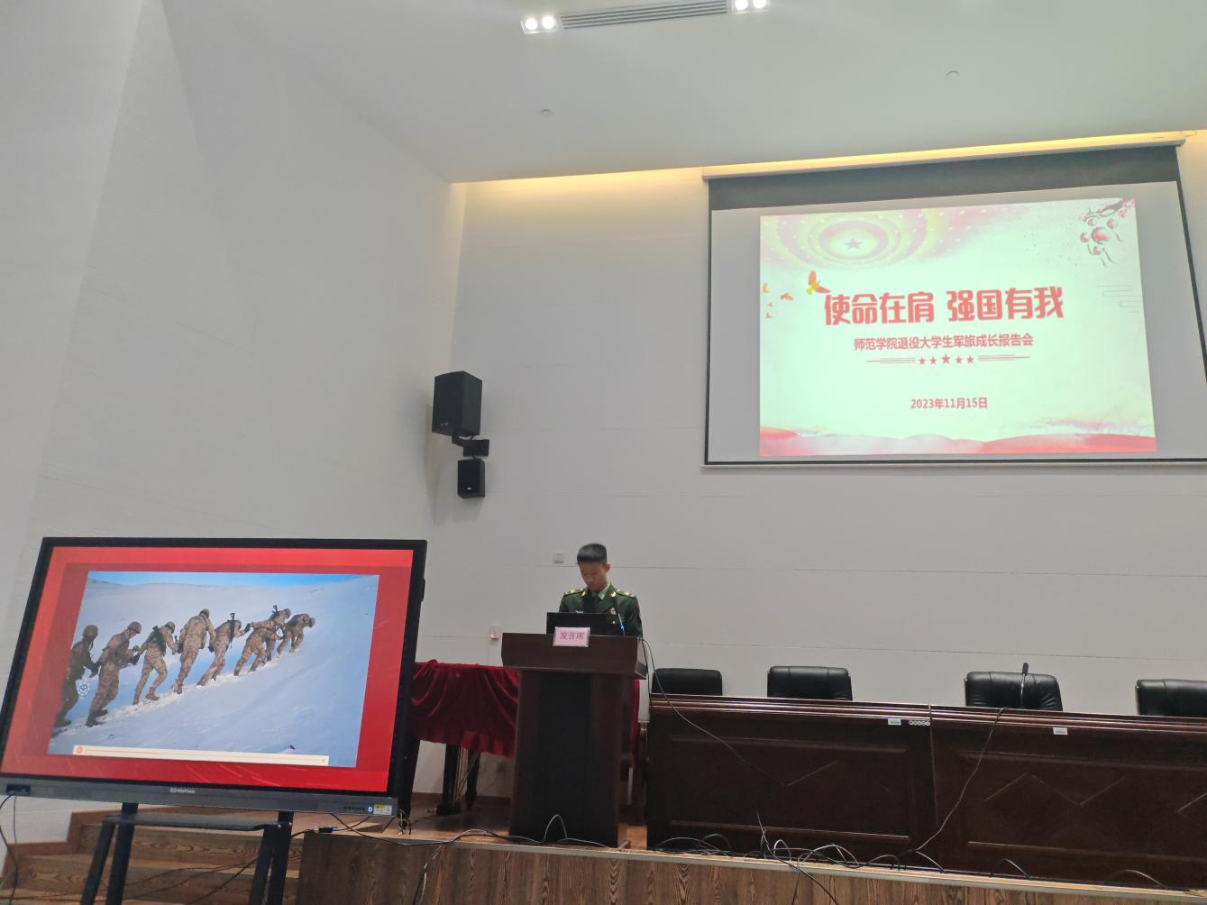 “热血青年征兵入伍,携笔从戎青春无悔”,为积极动员学生参军入伍,抒写红色初心,培育红色情怀,庚续红色血脉,树立以国家安全、民族大业为己任的责任意识,2023年11月15日晚上7点,师范学院在岳秀楼翔凤厅举行了以“使命在肩,强国有我”为主题的2023年退役大学生军旅成长报告会。师范学院党总支书记彭松林、团总支书记宋莹、学生科科长李智强、退役大学生代表及23级学生代表参加本场会议。