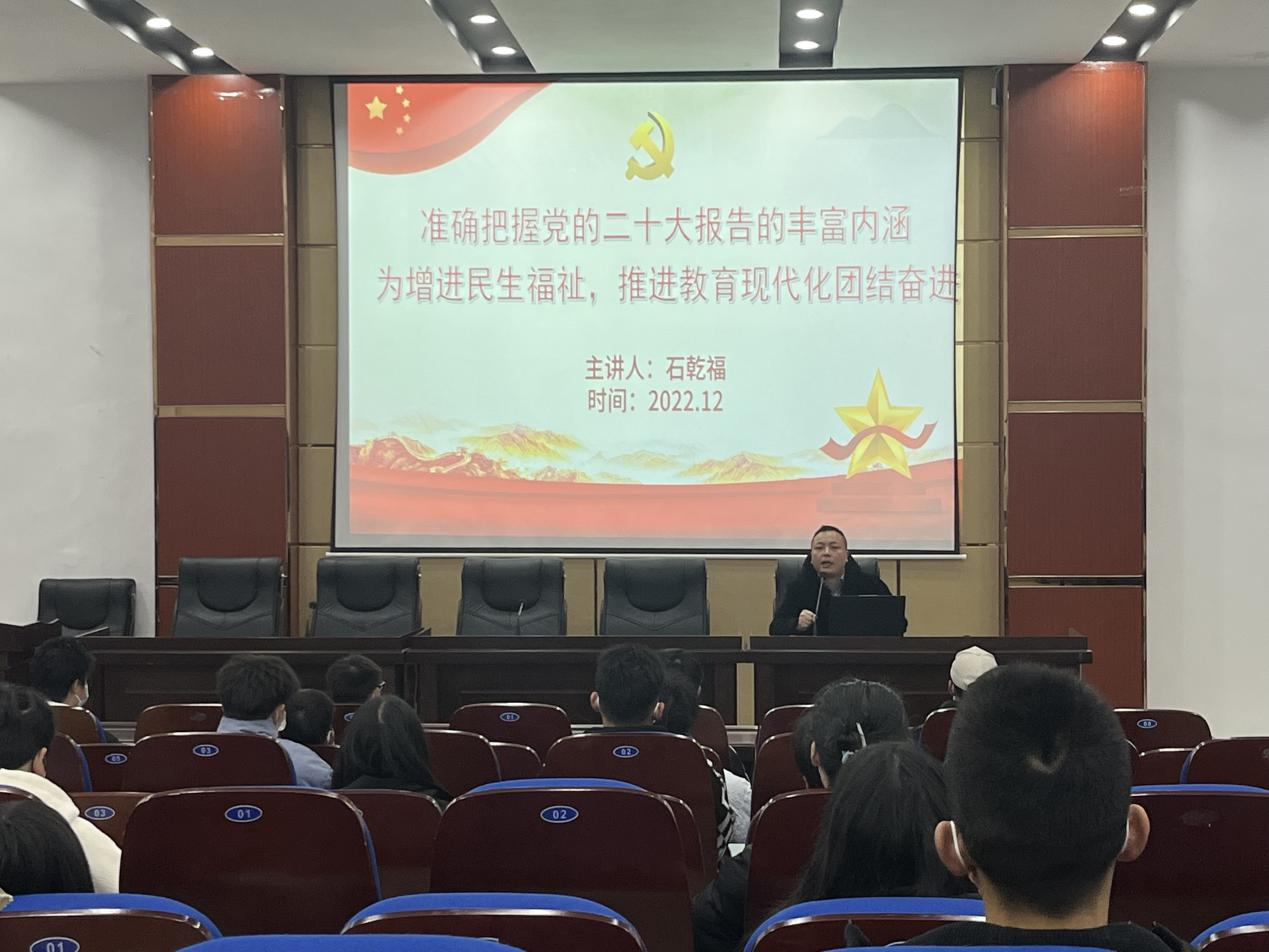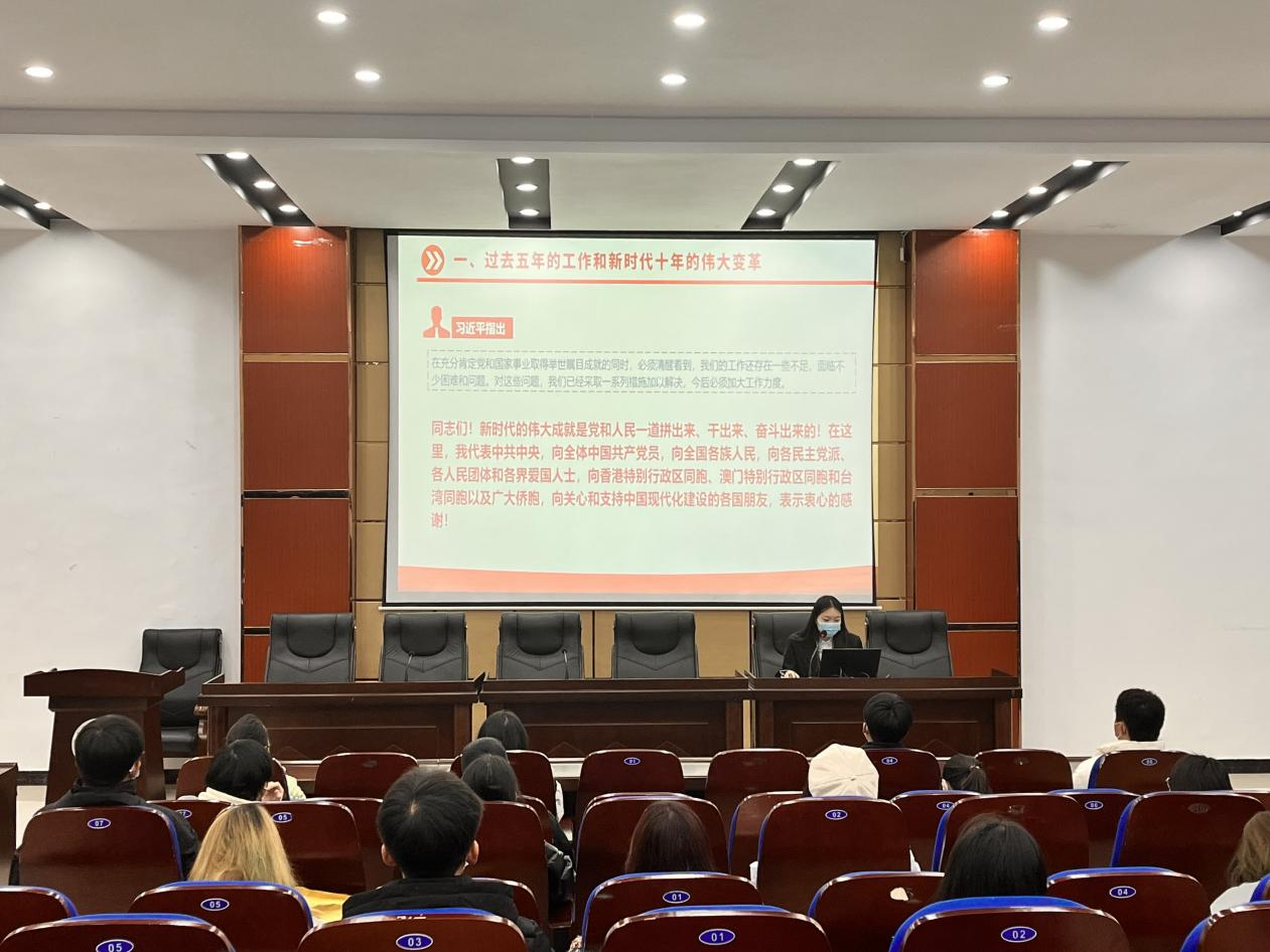 12月14日至16日,宣讲团在学校先圣厅连续开展了3场宣讲,来自各二级学院的学生代表近150人聆听了报告内容。马克思主义学院院长、直属党支部书记全程指导,为宣讲团提供了强力支持和宝贵建议,并通过示范课,紧密围绕党的二十大精神内涵,深入剖析了学生关注的教育、就业等内容,深刻阐述中国共产党为什么能、中国化时代化的马克思主义为什么行,示范课反响热烈,引发学生强烈共鸣。